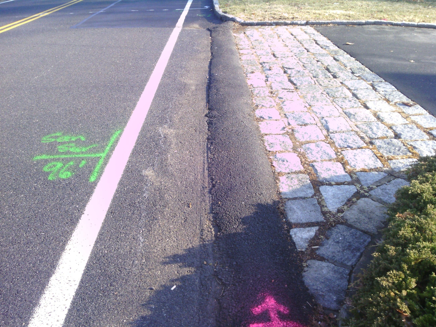MFS’s limited survey included edge of pavement, bottom of curb, corners of driveways, visible water curb stops to each house, visible sanitary cleanouts, manholes, inlets, valve covers, utility/light poles, fire hydrants, and other surface utility structures, existing subsurface utility mark out. Within the limits of the paved roadway, MFS developed contours at a one-foot interval. Rim elevations were obtained for storm and sanitary sewers. At accessible and unobstructed manholes and inlets, MFS’ team obtained down measurements to determine pipe inverts and measured the diameter of the pipe.