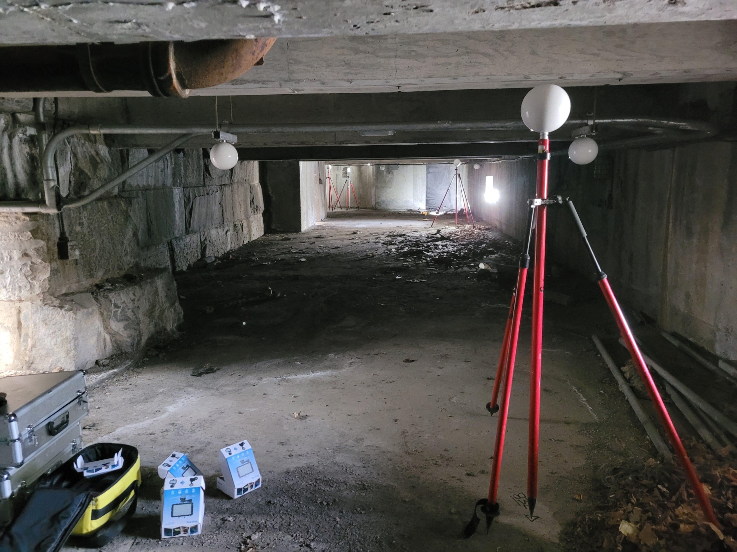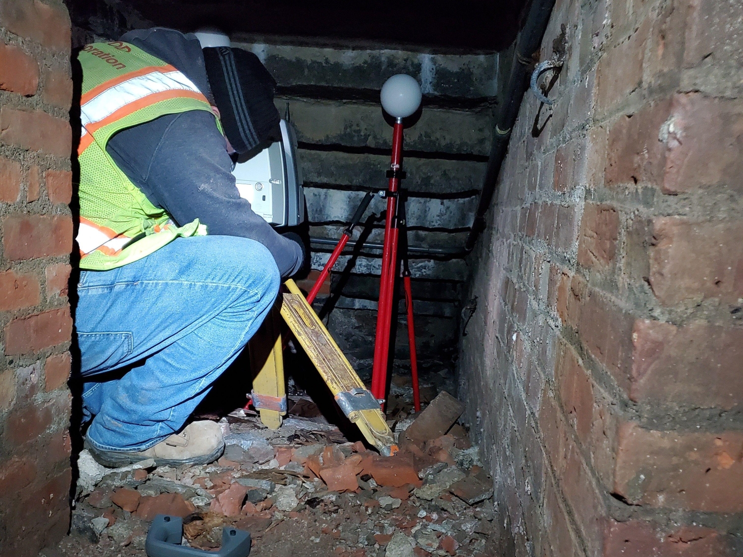 The survey team also conducted a utility survey to locate the apparent surface utilities surface hardware such as manholes, catch basins, trench drains, valve covers, utility/light poles, hydrants, etc. Additionally, a 3D laser scan of the stairway area was performed, which included interior spaces within scope limits, plus four high-definition scans of architectural elements for replication. MFS utilized a combination of cloud-to-cloud registration combined with multiple targets resection and survey control to register and constrain the 3d point cloud. MFS delivered a 3d point cloud in e57, rcp, or laz format.