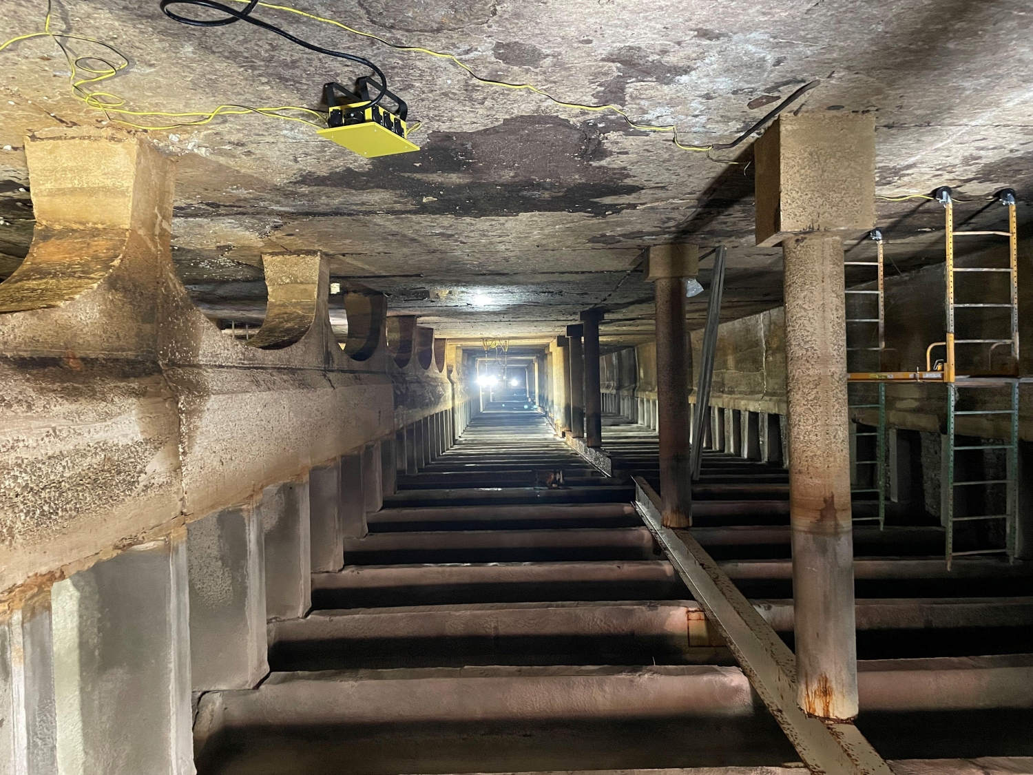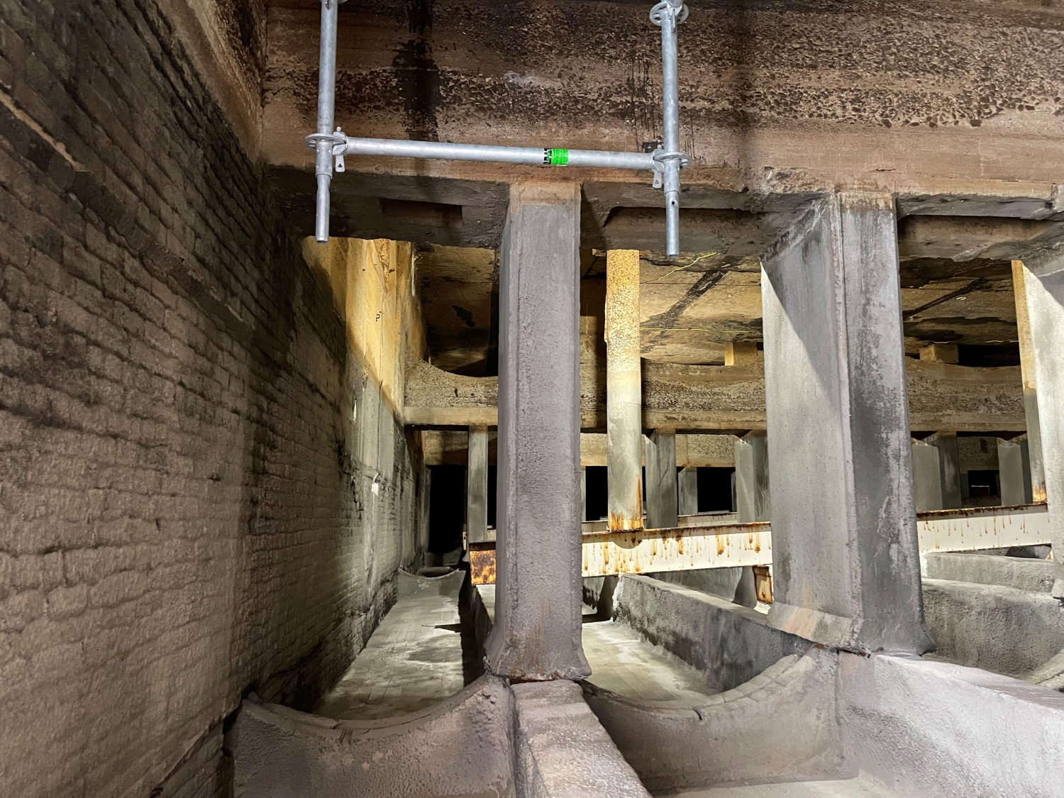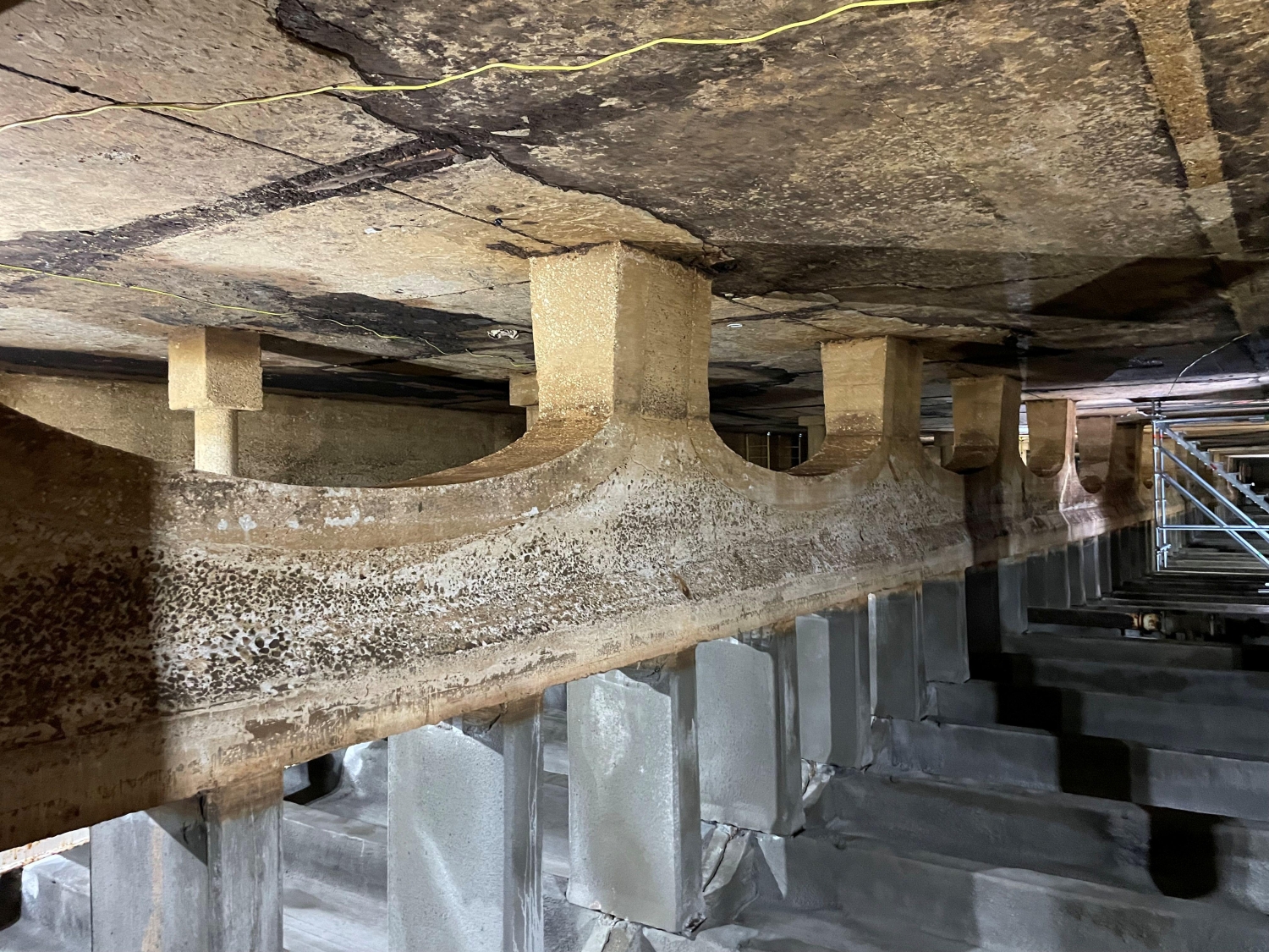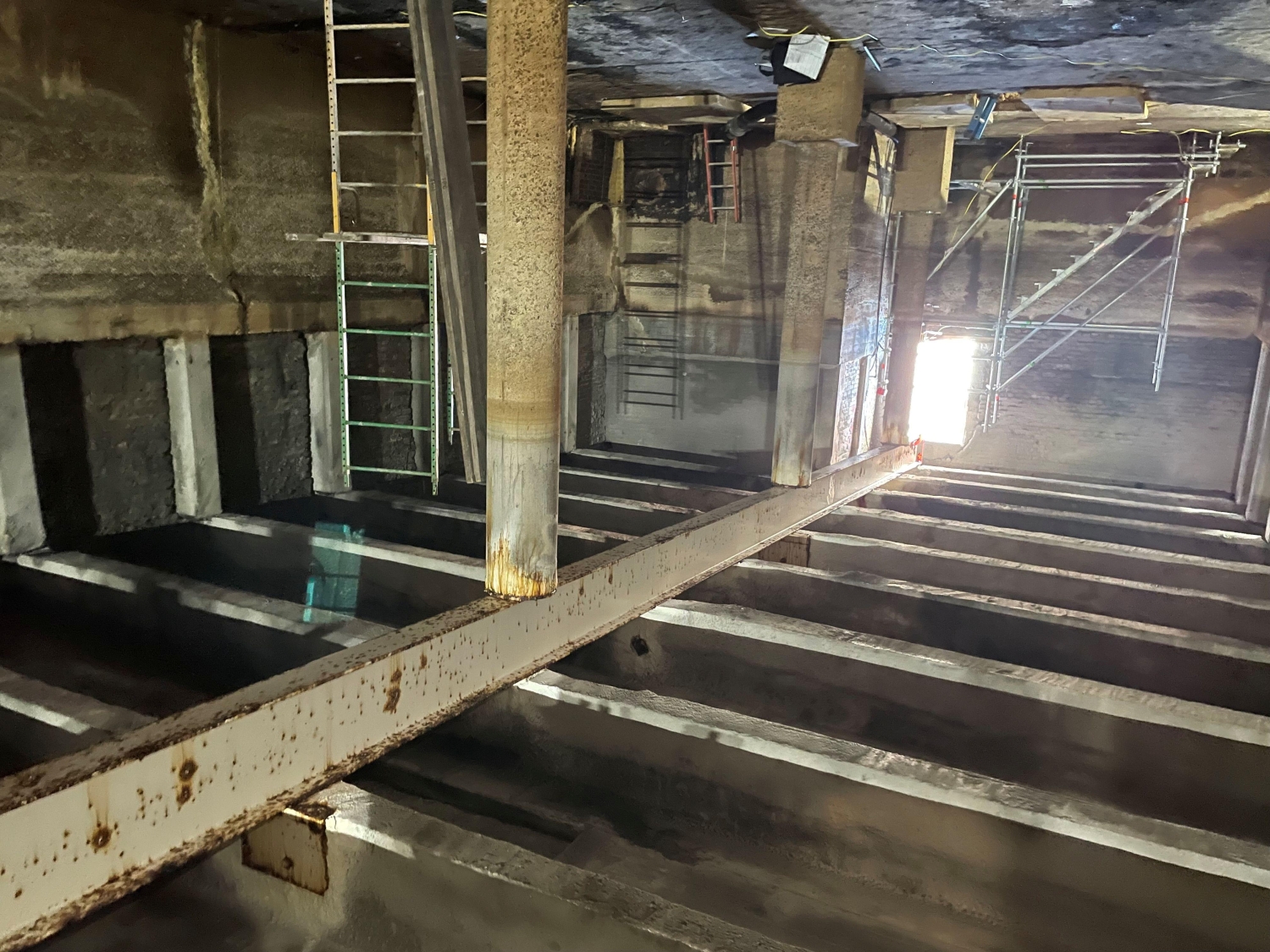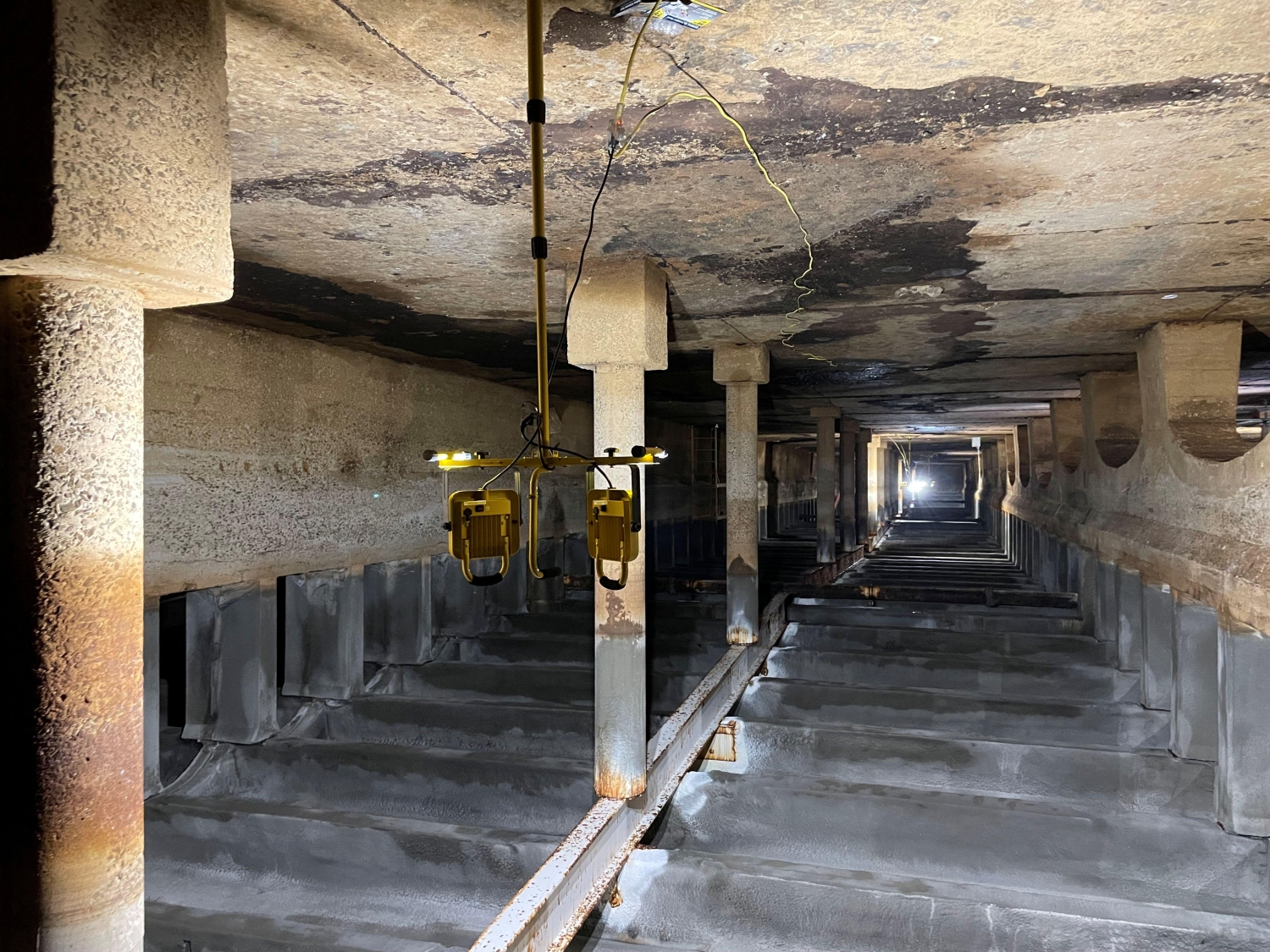 MFS’ structural team performed the structural inspections of the building’s interior and exterior to observe the roof framing system of the South Basin. During the inspection, MFS’ team visually observed the roof framing layout was typical throughout the South Basin, consisting of a 6-inch-thick concrete roof slab supported by typical 20-inch deep by 7-inch-wide cast-in-place concrete beams spaced at 5’-4”. The concrete beams were then supported by interior and exterior concrete columns which bear on interior concrete arch baffle walls and exterior foundation walls. MFS observed the original cast-in-place concrete roof beams were supported at midspan by a 18WF55 steel wide flange beam which was installed during the building rehabilitation in 1964.