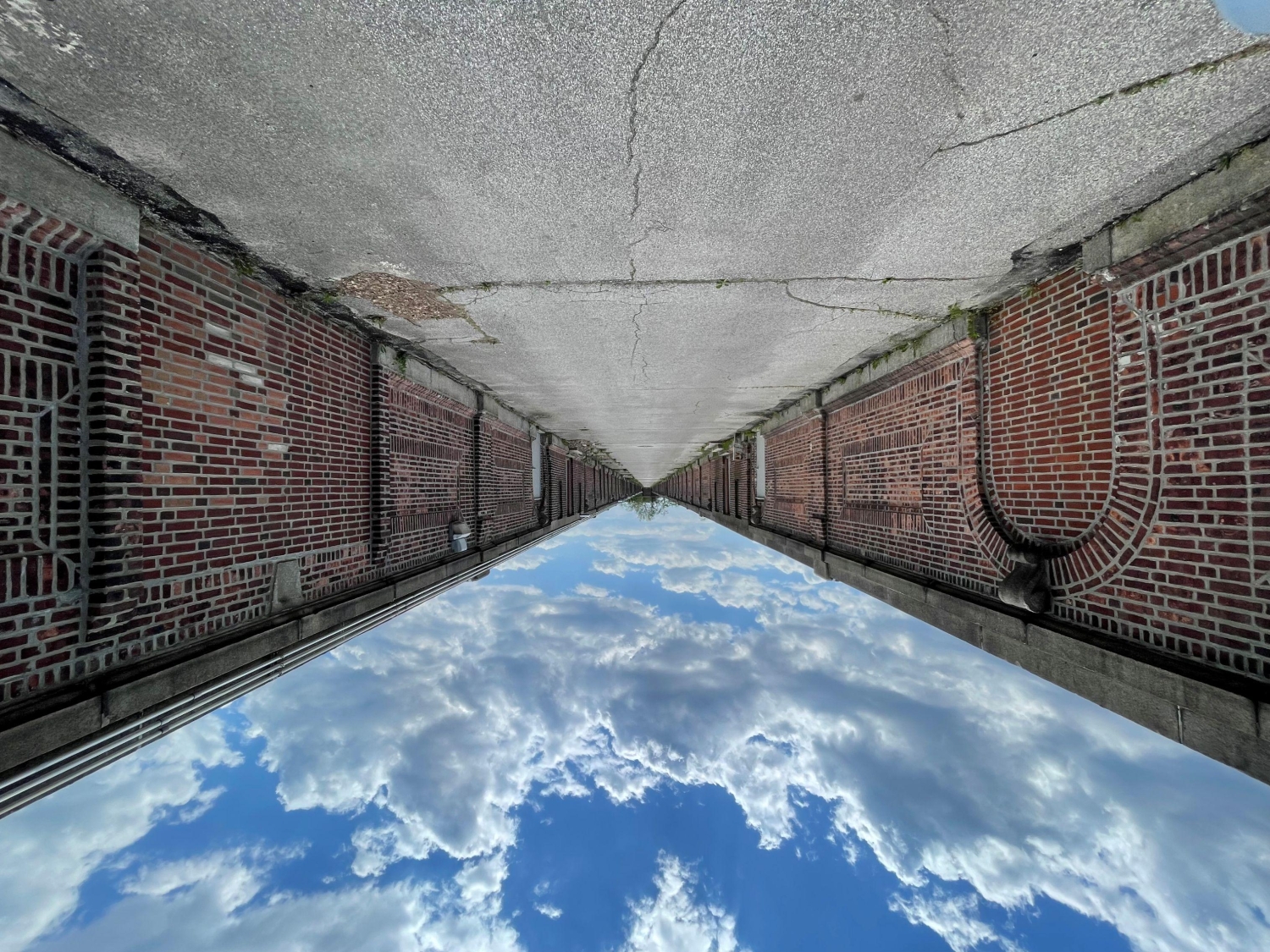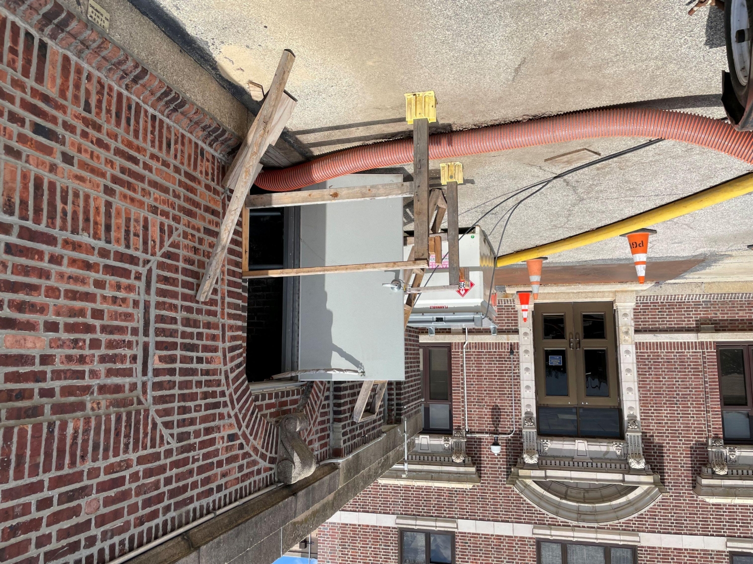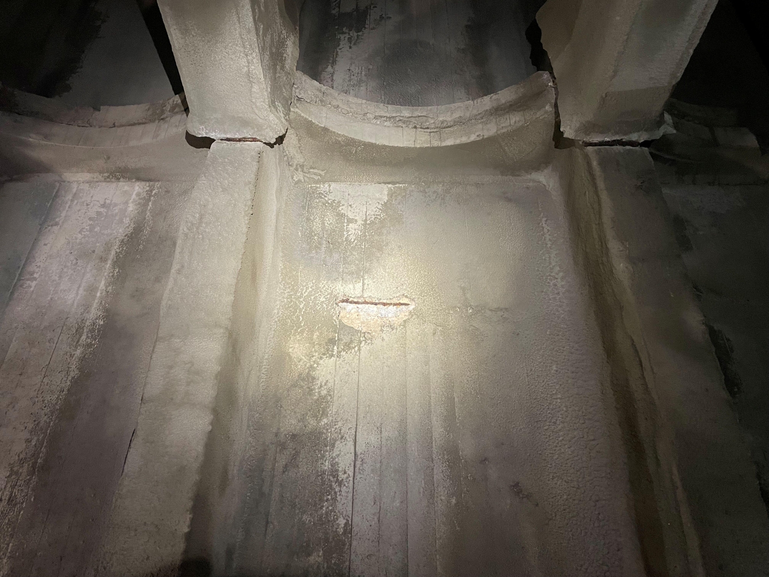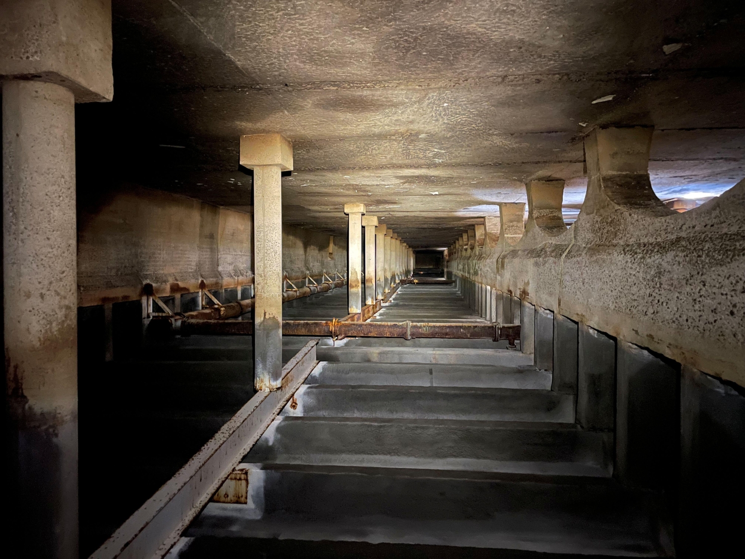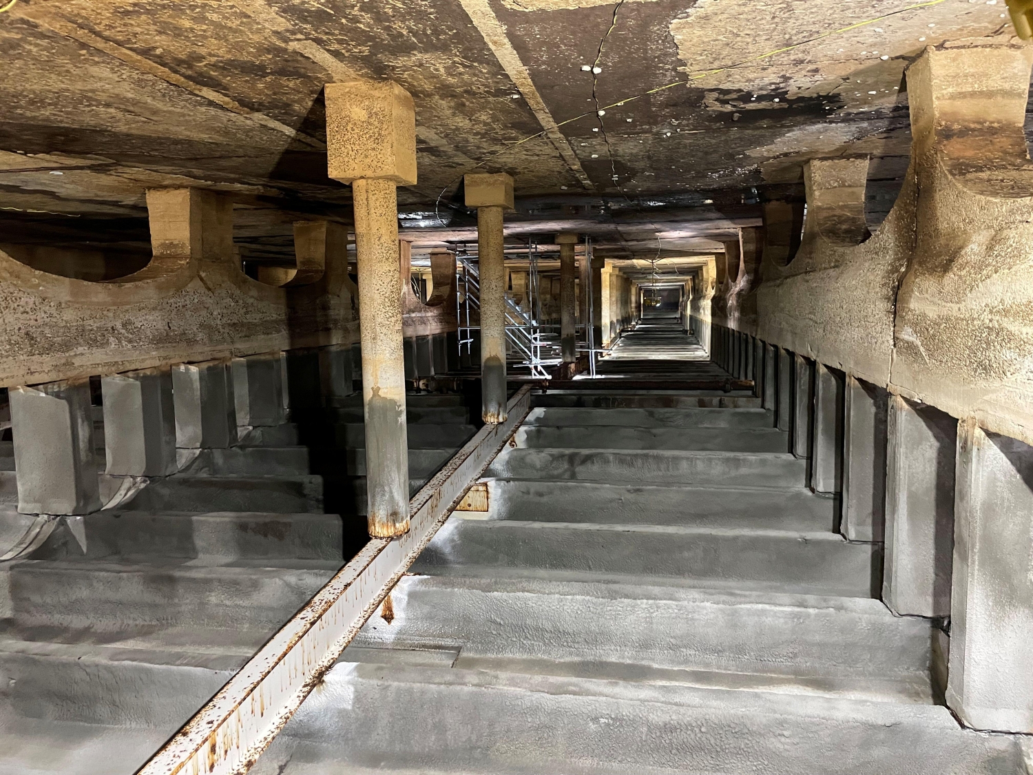 MFS’ structural team performed the structural inspections of the building’s interior and exterior to observe the roof framing system of the South Basin. During the inspection, MFS’ team visually observed the roof framing layout was typical throughout the South Basin, consisting of a 6-inch-thick concrete roof slab supported by typical 20-inch deep by 7-inch-wide cast-in-place concrete beams spaced at 5’-4”. The concrete beams were then supported by interior and exterior concrete columns which bear on interior concrete arch baffle walls and exterior foundation walls. MFS observed the original cast-in-place concrete roof beams were supported at midspan by a 18WF55 steel wide flange beam which was installed during the building rehabilitation in 1964.